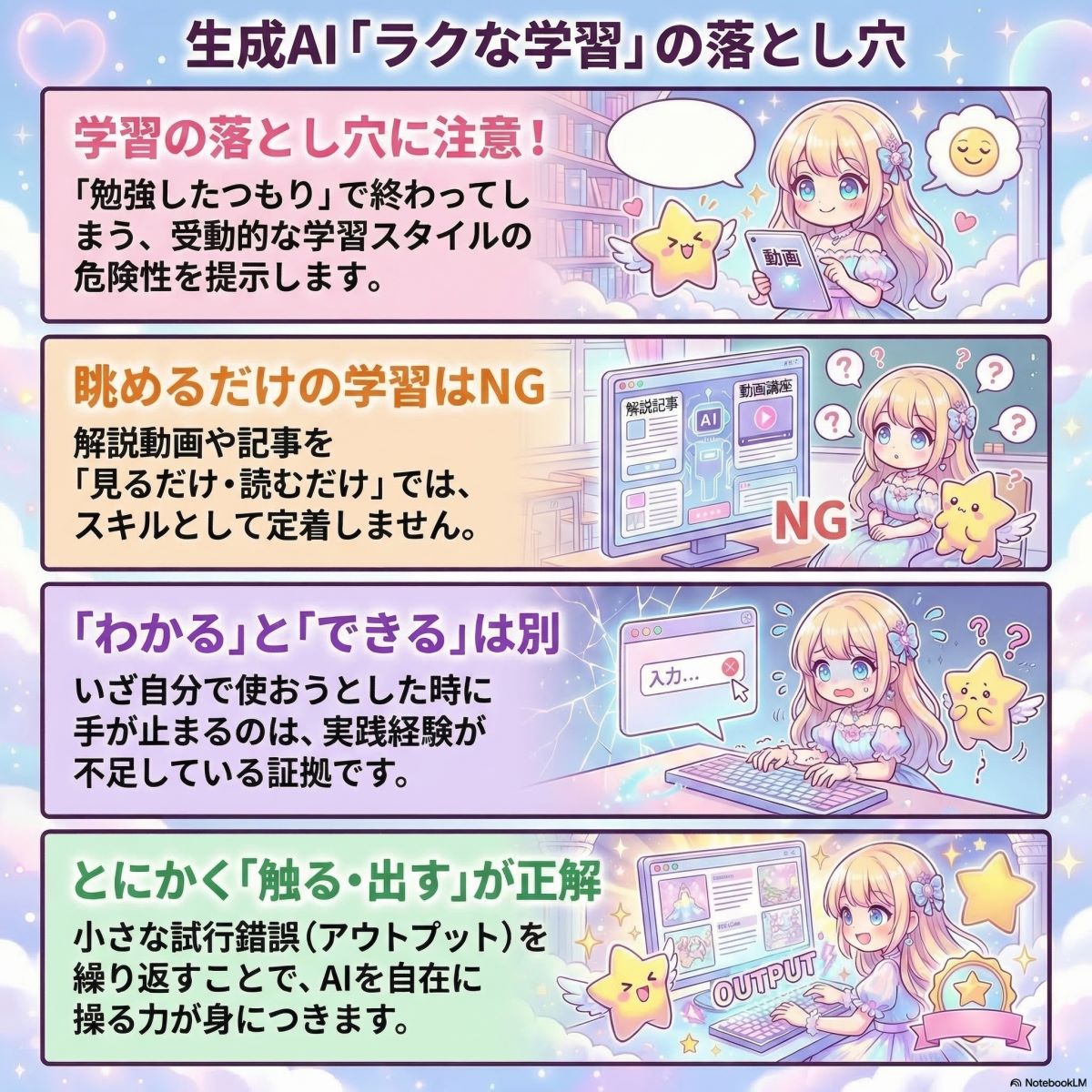 生成AIの学習でも「楽しくて楽」な方法だけを追い求めると、時間と労力が無駄になる可能性があります。