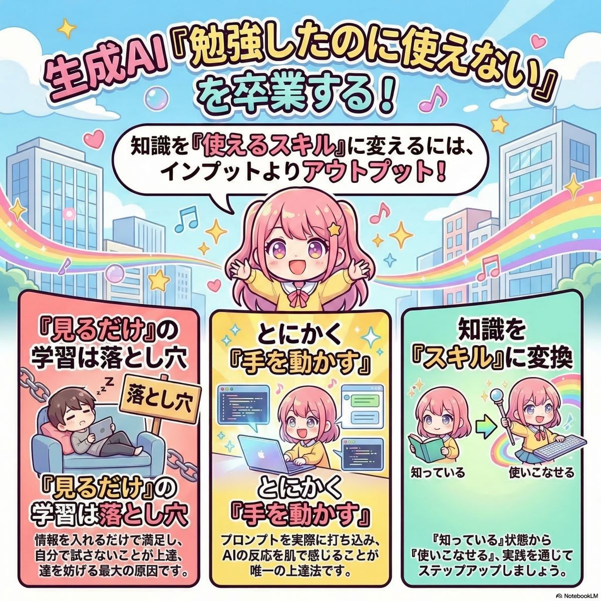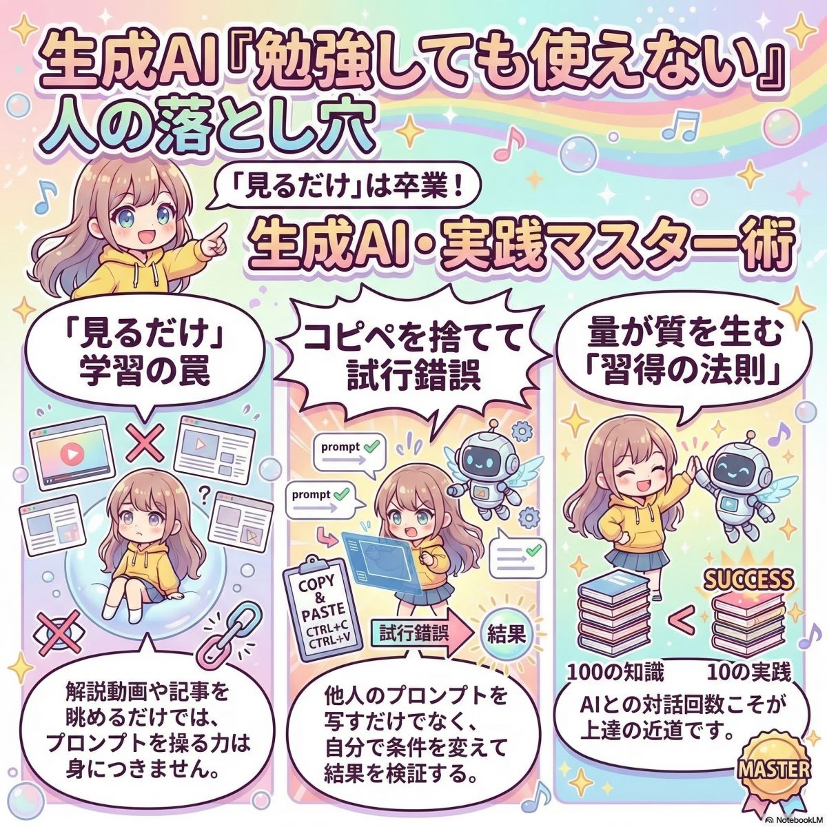 「わかりやすい解説でスラスラ理解できた感覚」と「自分の業務でAIを使いこなせる実力がついた状態」は、まったくの別物。脳に汗をかくような、ちょっとしたもどかしさを受け入れることが、費やした時間をちゃんとスキルに変えてくれる近道なんです。