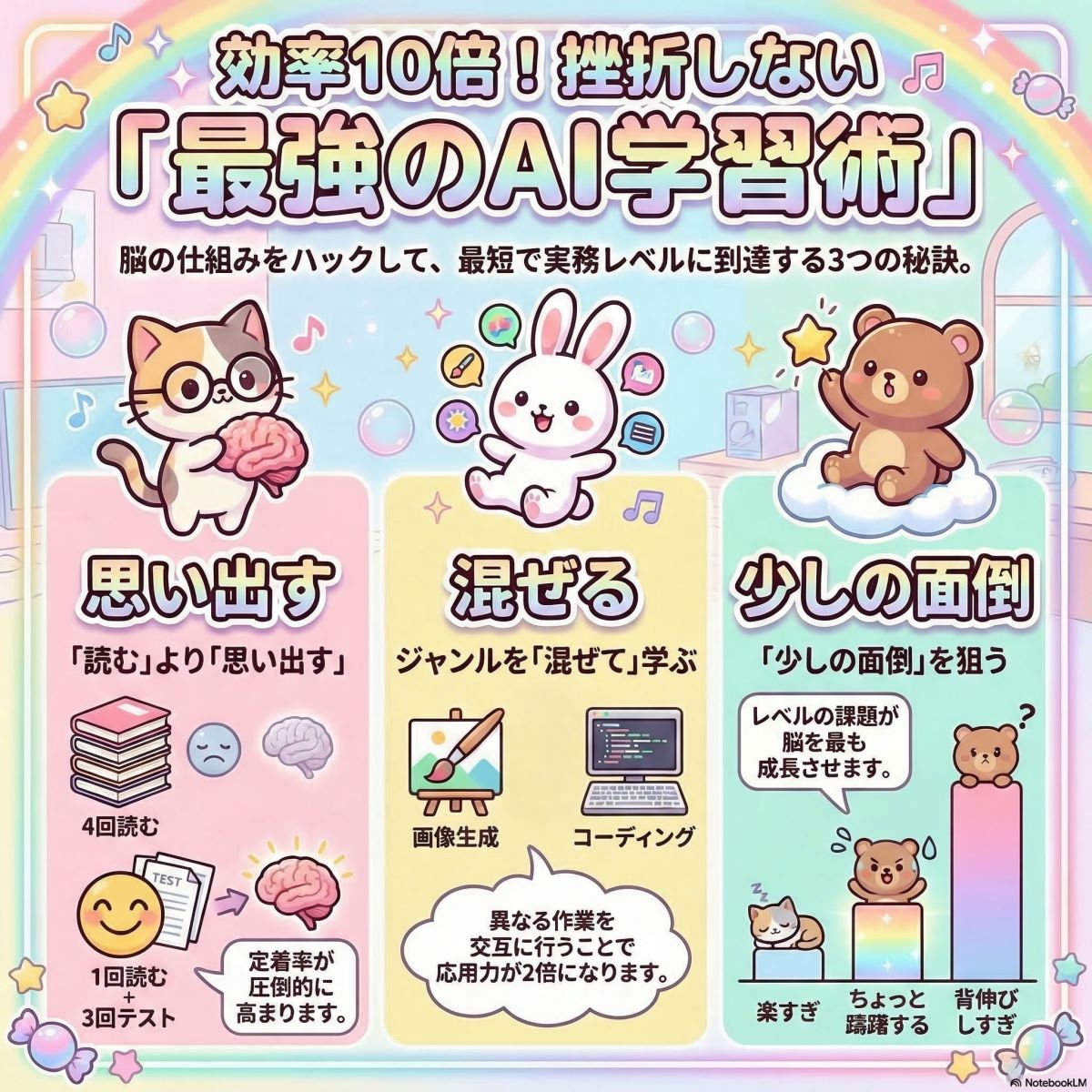 AI学習に置き換えると、こんな感じです。プロンプトエンジニアリングの記事を一通り読んだら、画面を閉じて「さっき出てきたテクニック、何があったっけ?」と思い出してみる。AIを使ったワークフロー改善の事例を見た後、何も見ずに「自分の業務だったらどう応用できるか」を紙に書き出してみる。このひと手間が、知識を本当の意味で自分のものにします。